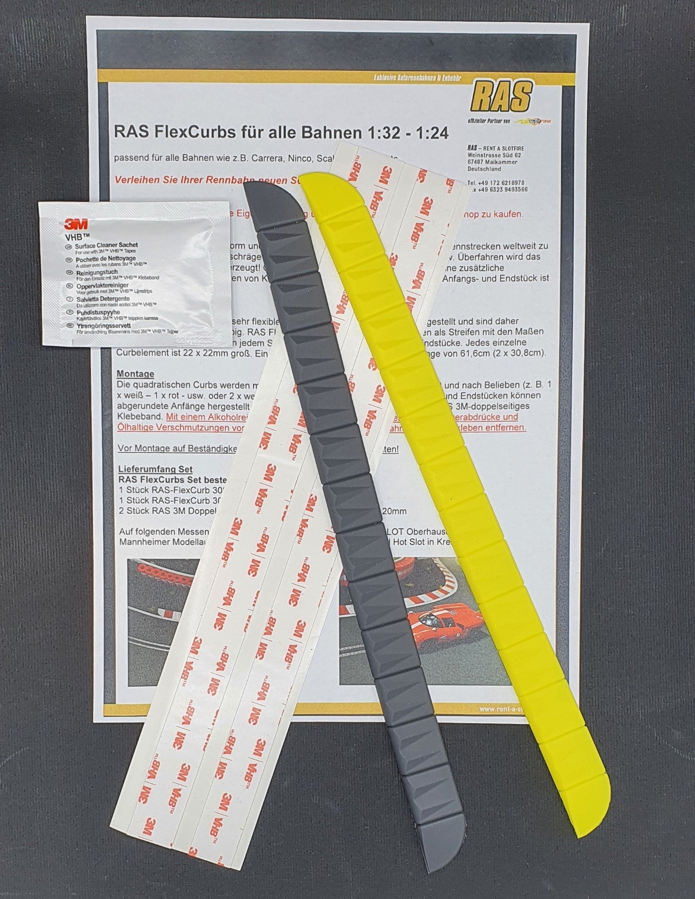 The square curbs are separated with a cutter knife and glued on as desired (e.g. 1 x black - 1 x yellow - etc. or 2 x black - 2 x yellow etc.). With the beginning and end pieces you can make black or white beginnings. For gluing we recommend our 3M double-sided special adhesive tape. The 3M VHB cleaning cloth removes release agents and grease from curbs and track. Please check the resistance of the surfaces / substrates before mounting!