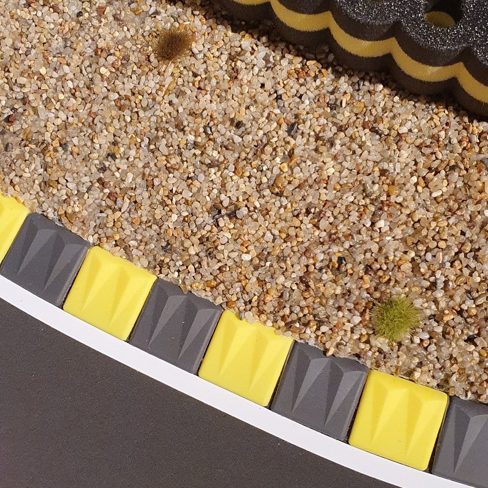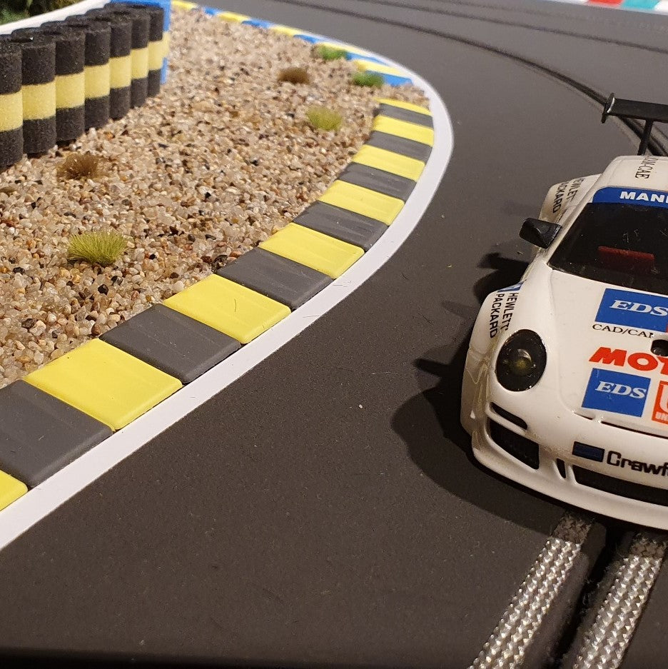 RAS Flex Curbs have the form and function of real curbs as found on race tracks around the world. They have a slanted shape and a grooved contour. When drifting or driving over them, the "rattling" is produced just like the original! Visually, your track is enhanced as you get additional orientation when going through turns and corner exits. The beginning and end piece is rounded.