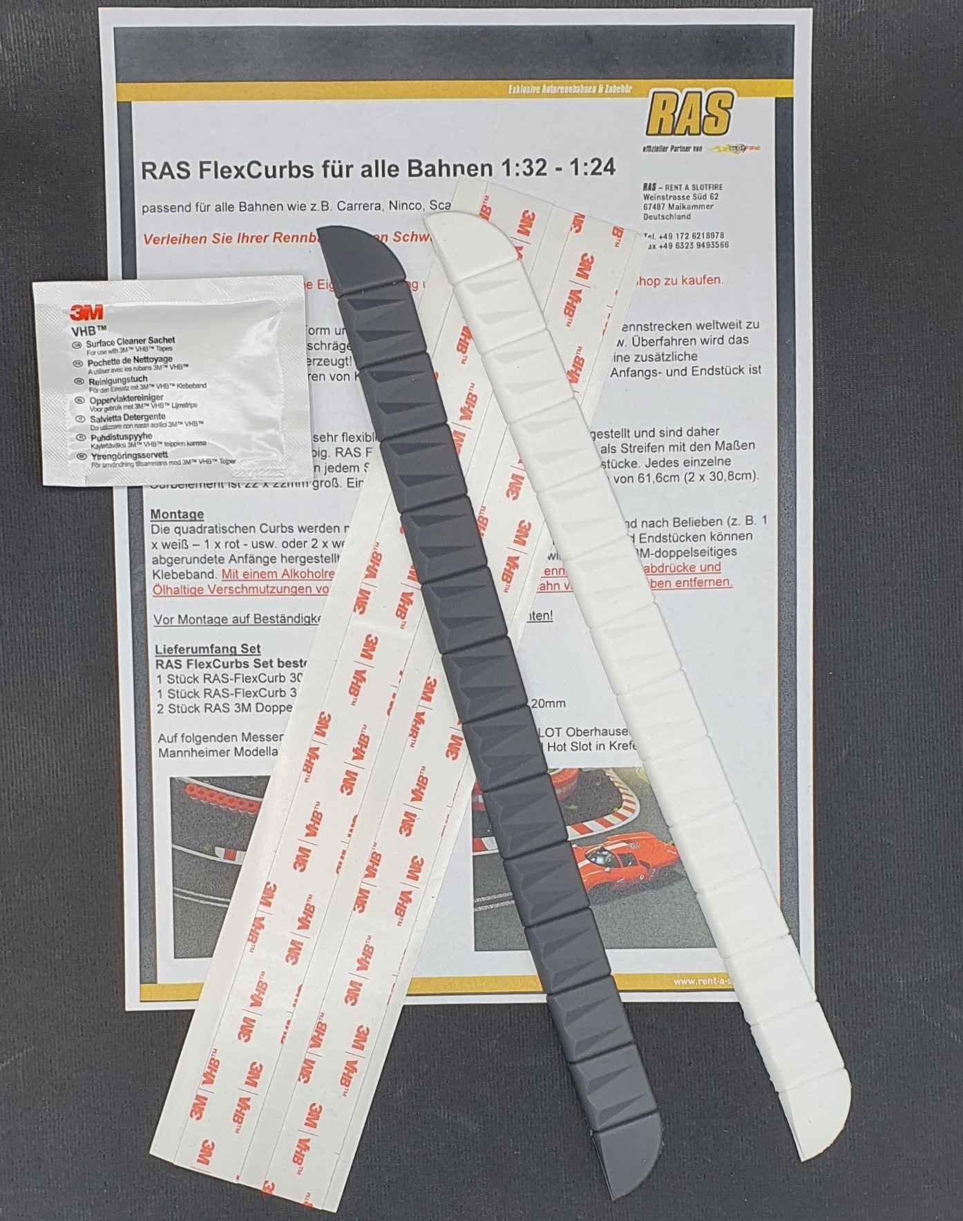 The square curbs are separated with a cutter knife and glued on as desired (e.g. 1 x black - 1 x white- etc. or 2 x black - 2 x white- etc.). With the beginning and end pieces you can make black or white beginnings. For gluing we recommend our 3M double-sided special adhesive tape. The 3M VHB cleaning cloth removes release agents and grease from curbs and track. Please check the resistance of the surfaces / substrates before mounting!