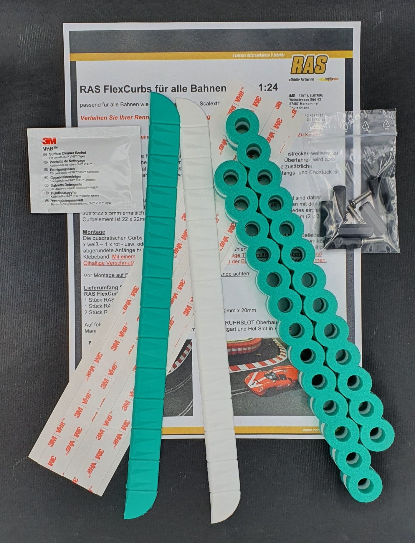 The square curbs are separated with a cutter knife or scissors and glued on as desired (e.g. 1 x white - 1 x green - or 2 x white - 2 x green etc.). Rounded beginnings can be made with the beginning and end pieces. For gluing we recommend our RAS 3M double-sided adhesive tape. It is essential to use the 3M VHB cleaning cloth to remove the waxy release agent, fingerprints and oil-containing dirt from the underside of the curbs and the track before bonding.