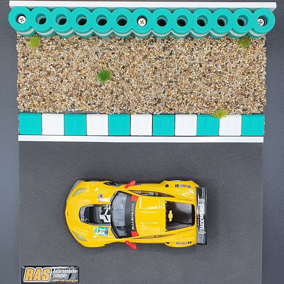FlexCurbs have the form and function of real curbs as found on race tracks around the world. They have an angled shape and a grooved contour. When drifting or driving over them, the "chatter" is produced just like the original! Visually, your track will be enhanced as you will have additional orientation when going through turns and corner exits. It is an optical deco element. The beginning and end piece is rounded in each case.