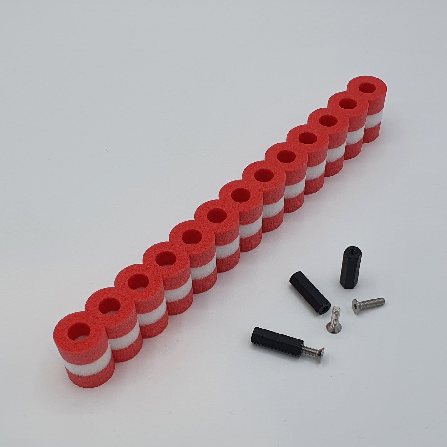 La livraison comprend une pile de pneus de 25 cm de long, des douilles de fixation et 3 vis. Il existe d'autres variantes de couleurs et de longueurs. Lors du montage, les fixations noires avec filetage intérieur sont vissées par le bas. Il est possible de percer à travers un rail ou une bande de rive. Il est également possible d'utiliser un morceau de bois comme bordure à côté du rail.