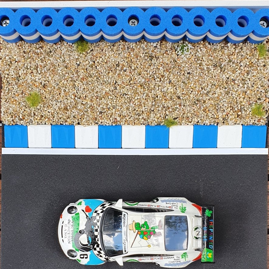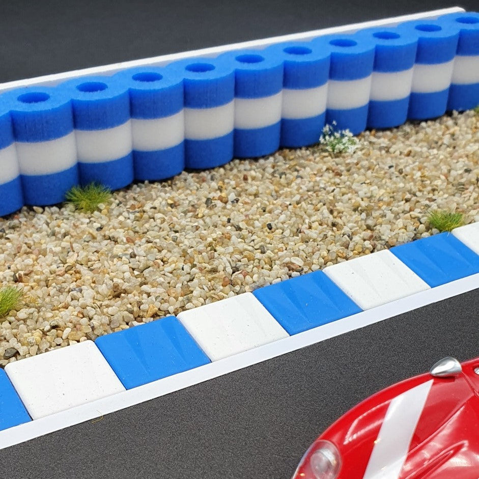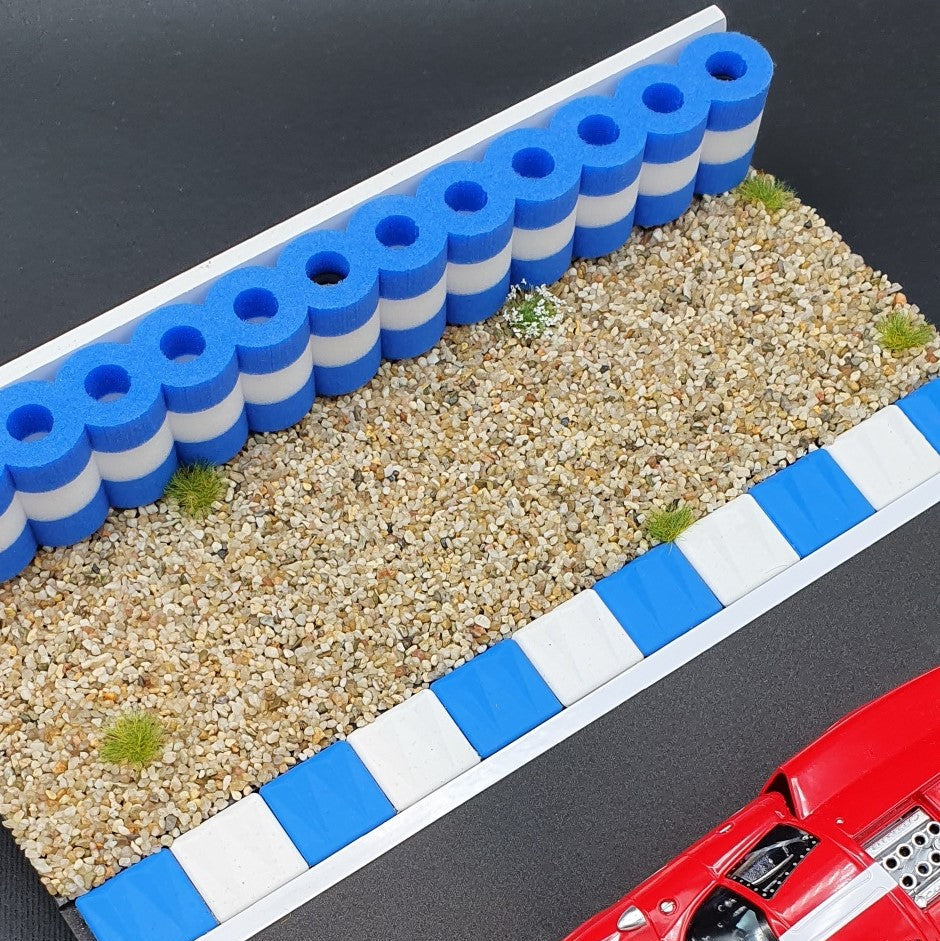A fond dans les glissières de sécurité ! Pas de problème avec notre pile de pneus pour circuit de course BLEU BLANC 1:32 - 1:24.