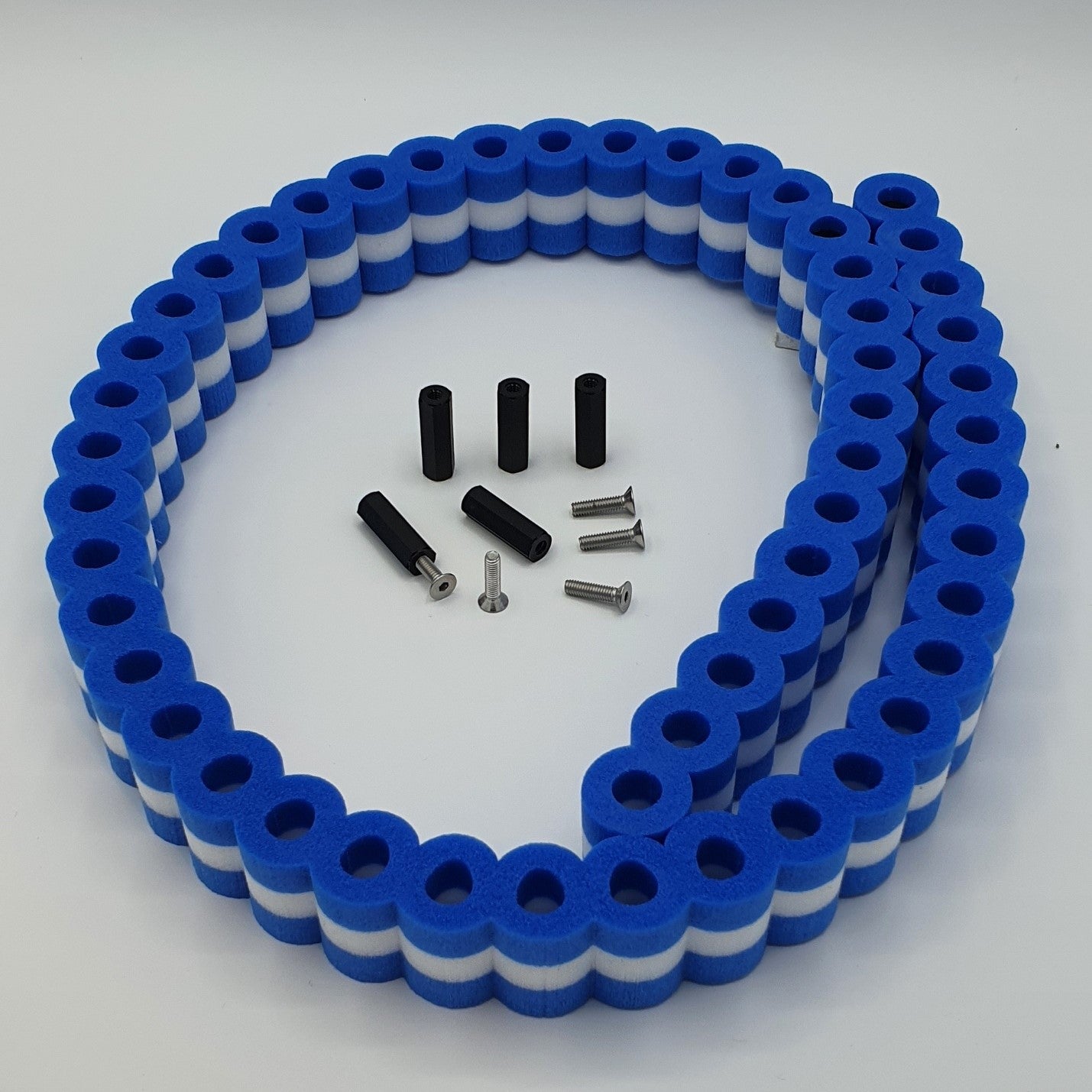 La livraison comprend une pile de pneus de 99 cm de long, des douilles de fixation et 5 vis. Il existe d'autres variantes de couleurs et de longueurs. Lors du montage, les fixations noires avec filetage intérieur sont vissées par le bas. Il est possible de percer à travers un rail ou une bande de rive. Il est également possible d'utiliser un morceau de bois comme bordure à côté du rail.