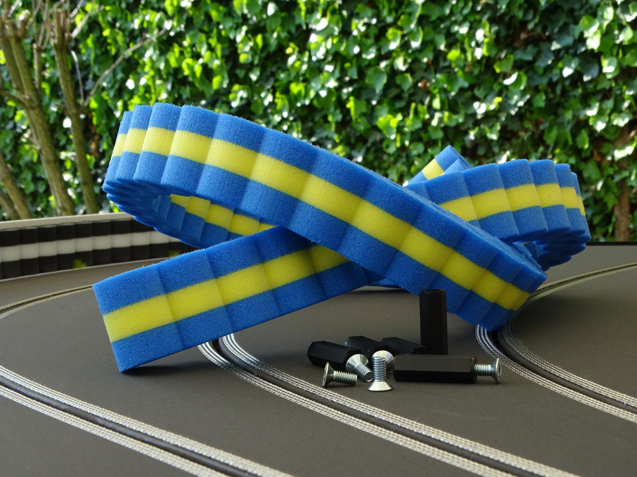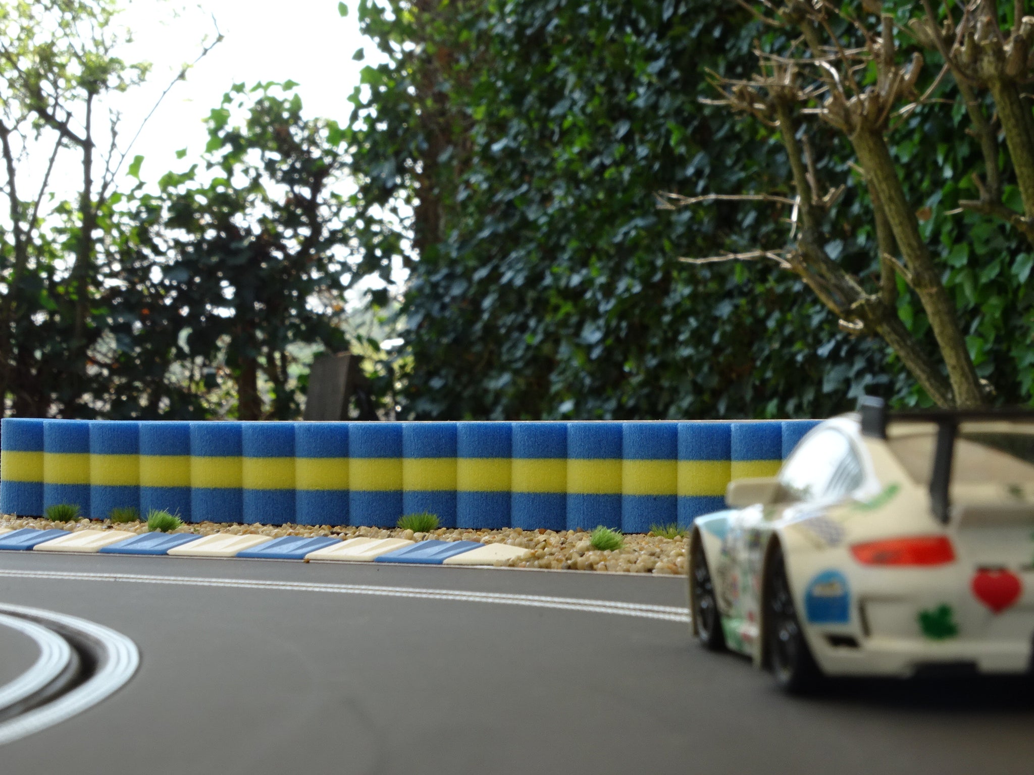 A fond dans les glissières de sécurité ! Pas de problème avec notre pile de pneus > pour les circuits Carrera BLEU JAUNE 1:32 - 1:24