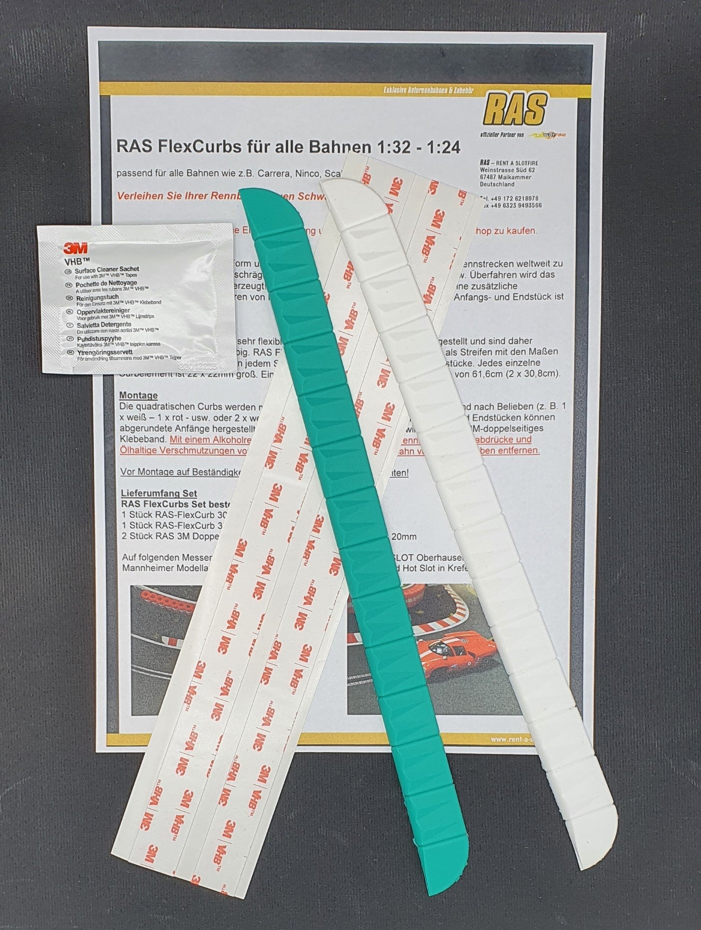I cordoli RAS Flex hanno la forma e la funzione dei veri cordoli che si trovano sulle piste di tutto il mondo. Hanno una forma inclinata e un contorno scanalato. Quando si derapa o si guida su di essi, si produce un "rattling" proprio come l'originale! Il tracciato viene migliorato dal punto di vista visivo, in quanto si ottiene un orientamento aggiuntivo durante la guida in curva e in uscita di curva. I pezzi iniziali e finali sono arrotondati.