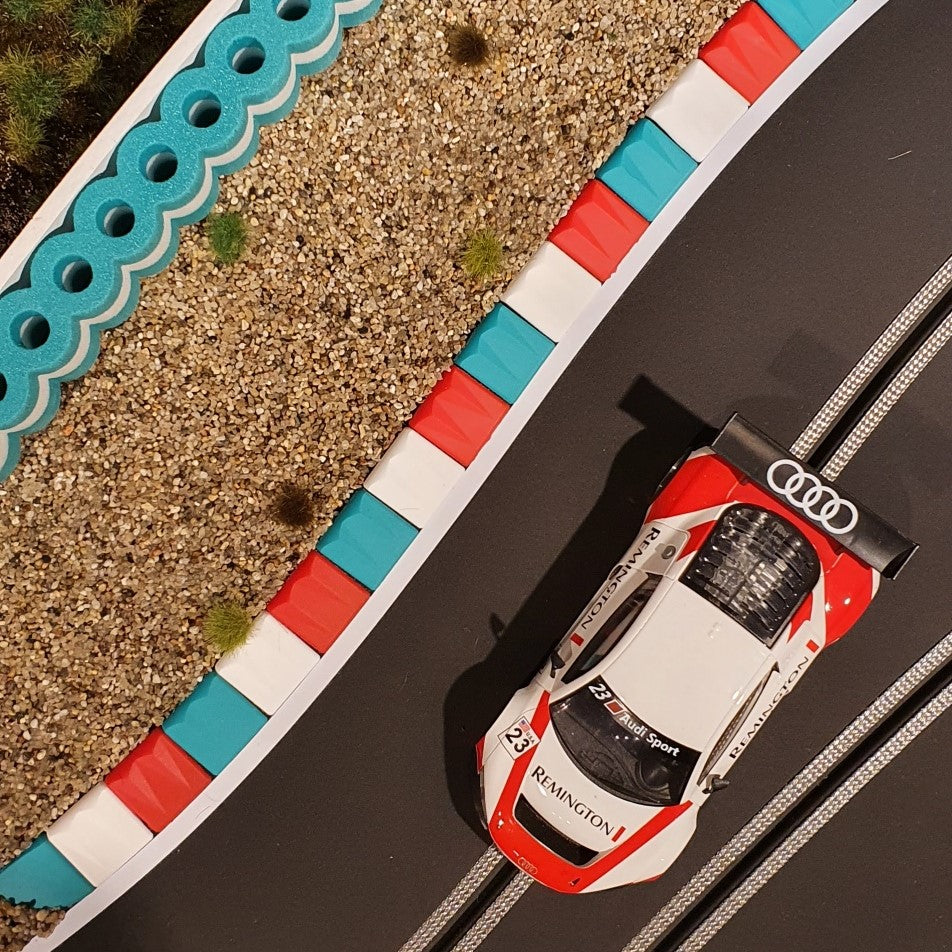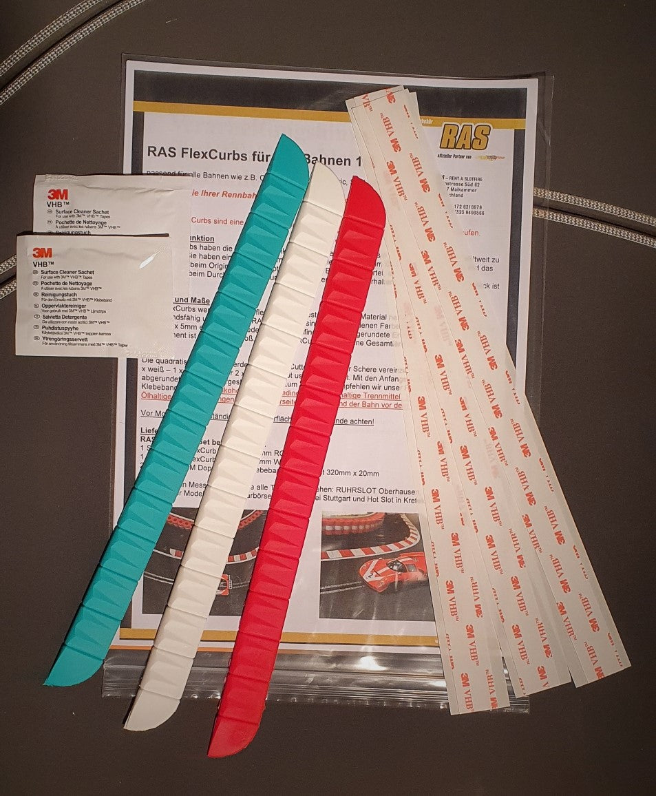 I cordoli RAS Flex hanno la forma e la funzione dei veri cordoli che si trovano sui circuiti di tutto il mondo. Hanno una forma inclinata e un contorno scanalato. Quando si derapa o si guida su di essi, si produce un "rattling" proprio come l'originale! L'aspetto visivo della pista è migliorato, in quanto si ottiene un orientamento aggiuntivo durante la guida in curva e in uscita di curva. I pezzi iniziali e finali sono arrotondati.