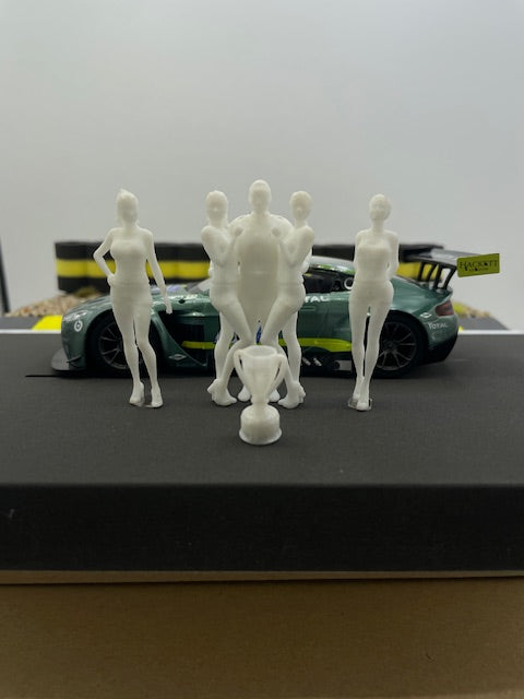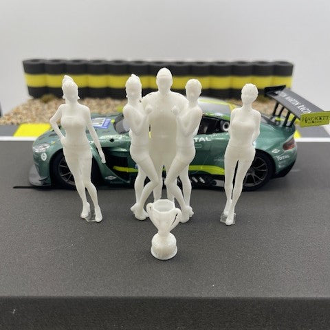 Modellino 1/32 dipinto a mano di 1 pilota con 4 ragazze della griglia bianco-blu e trofeo per le piste da corsa