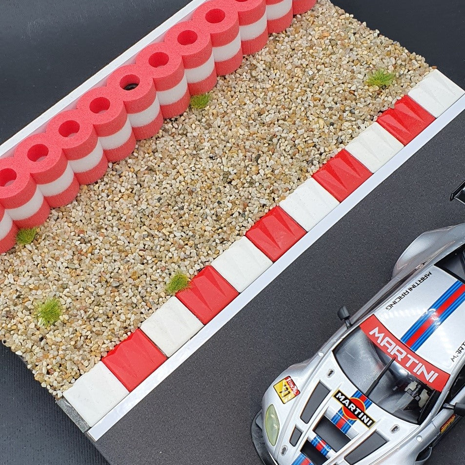 I FlexCurbs di RAS hanno la forma e la funzione dei veri cordoli che si trovano sui circuiti di tutto il mondo. Hanno una forma inclinata e un contorno scanalato. Quando si derapa o si guida su di essi, il suono "sferragliante" viene prodotto proprio come l'originale! Il tracciato ne risulterà migliorato dal punto di vista visivo, in quanto l'orientamento sarà maggiore durante la percorrenza di curve e uscite di curva. È un elemento di decoro ottico. I pezzi iniziali e finali sono arrotondati.