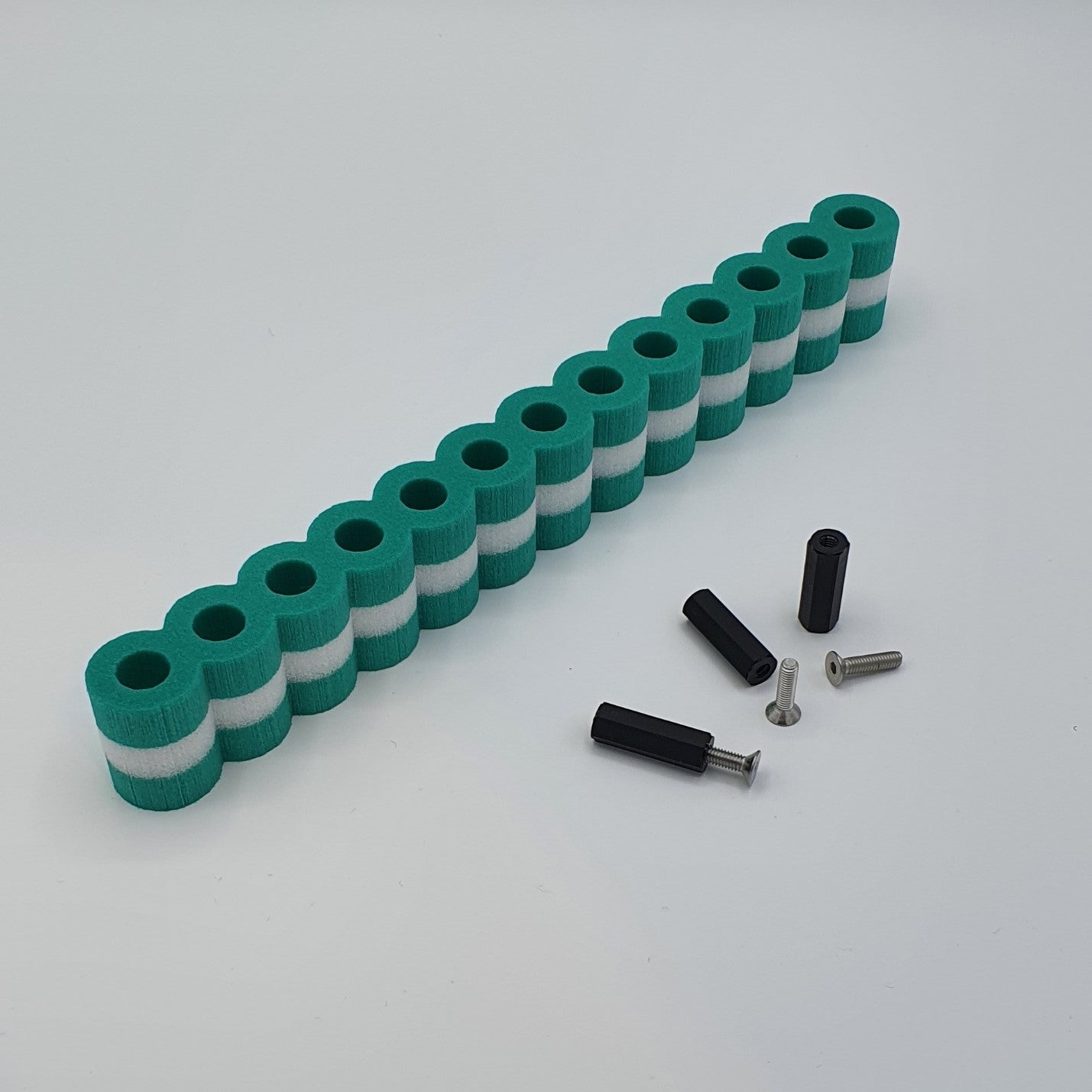 La fornitura comprende una pila di pneumatici lunga 25 cm, i manicotti di fissaggio e 3 viti. Esistono altre varianti di colore e lunghezza. Per il montaggio, i fissaggi neri con filettatura interna vengono avvitati dal basso. La foratura può essere effettuata attraverso un binario o una striscia di bordo. In alternativa, è possibile utilizzare un pezzo di legno come listello accanto alla guida.